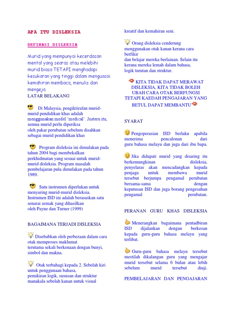 Strategi Pengajaran Kanak-kanak Disleksia di dalam Bilik Darjah Terdapat banyak teknik untuk mengajar anak-anak disleksia. Oleh itu mereka akan dapat mengekalkan ingatan tentang pelajaran dalam jangka waktu yang lebih lama. Aktiviti-aktiviti perlulah melibatkan murid secara aktif.